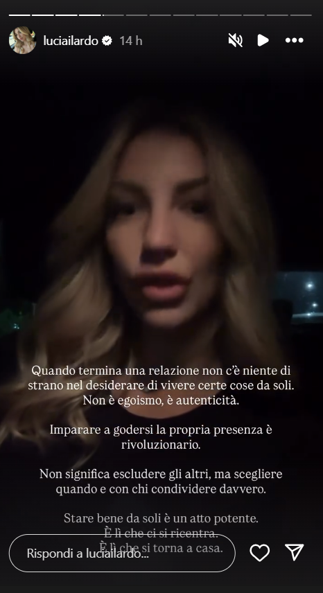 Ecco riportate, di seguito, le dichiarazioni di Lucia Ilardo sul suo profilo Instagram ufficiale: “Quando termina una relazione non c’è niente di strano nel desiderare di vivere certe cose da soli. Non è egoismo, è autenticità. Imparare a godersi la propria presenza è rivoluzionario”.