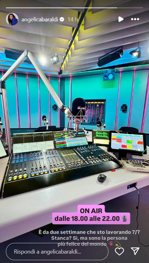 Ecco riportate, di seguito, le dichiarazioni della Baraldi sul suo profilo Instagram ufficiale: “On air dalle 18.00 alle 22.00.. è da due settimane che sto lavorando 7/7. Stanca? Sì, ma sono la persona più felice del mondo”.