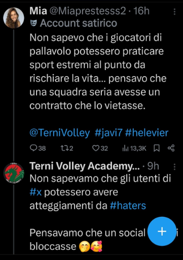 E il Terni Volley Academy ha replicato: “Non sapevamo che gli utenti di X potessero avere atteggiamenti da haters. Pensavamo che un social li bloccasse”. Che cosa ne pensate?