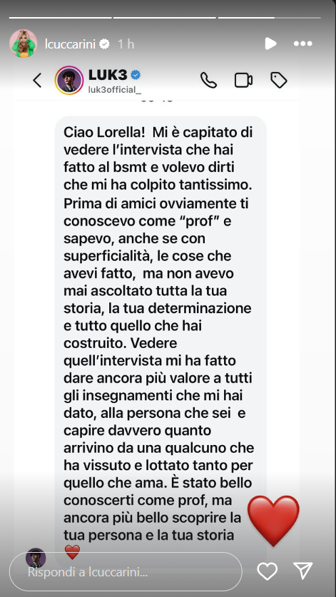 Ecco le dichiarazioni di Luk3: “Ciao Lorella! Mi è capitato di vedere l’intervista che hai fatto al bsmt e volevo dirti che mi ha colpito tantissimo. Prima di Amici ovviamente ti conoscevo come ‘prof’ e sapevo, anche se con superficialità, le cose che avevi fatto, ma non avevo mai ascoltato tutta la tua storia, la tua determinazione e tutto quello che hai costruito”.