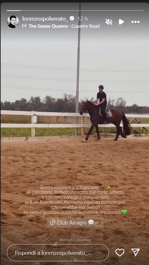 Ecco riportate, di seguito, le parole di Spolverato: “Quinta lezione e si galoppa. Mi coccolano, mi mettono sotto, con tanto affetto, e con i loro consigli e insegnamenti io e Mr Boombastic facciamo passi da purosangue. Chi l’avrebbe mai detto? Da zaro a galoppo in poche settimane, impazzisco”.