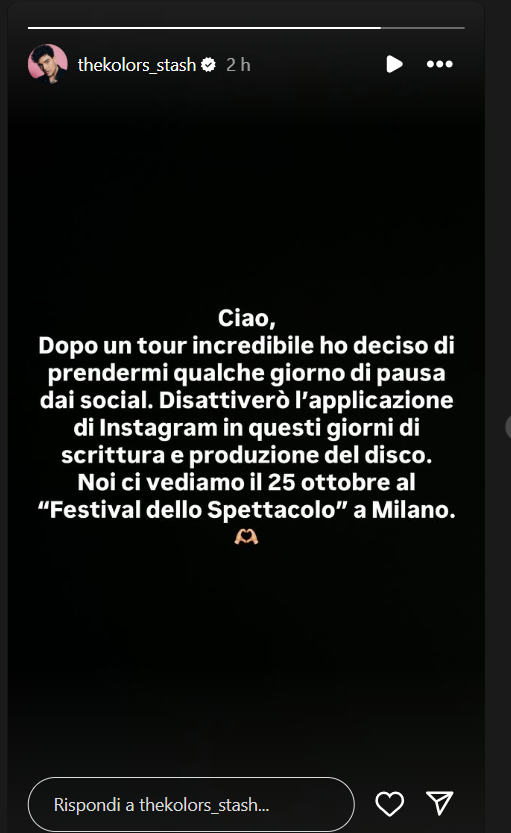 Ecco riportate, di seguito, le parole di Stash: “Ciao, dopo un tour incredibile ho deciso di prendermi qualche giorno di pausa dai social. Disattiverò l’applicazione di Instagram in questi giorni di scrittura e produzione del disco. Noi ci vediamo il 25 ottobre al Festival dello Spettacolo a Milano”.