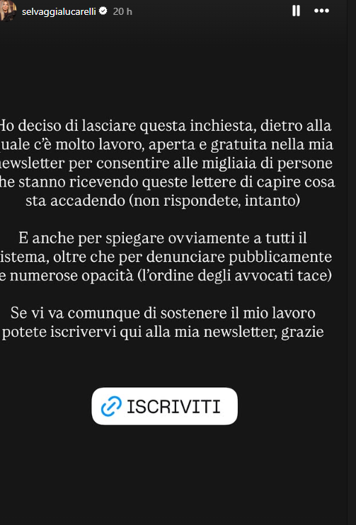 Poche ore dopo la pubblicazione dell’inchiesta, Selvaggia ha condiviso una serie di storie Instagram per commentare le numerose segnalazioni ricevute. Nella prima, la giornalista spiega di aver deciso di rendere l’inchiesta gratuita sulla newsletter “Vale Tutto”, scrivendo: “Ho deciso di lasciare questa inchiesta aperta e gratuita per consentire alle migliaia di persone che stanno ricevendo queste lettere di capire cosa sta accadendo (non rispondete, intanto). E anche per denunciare pubblicamente le opacità. L’Ordine degli avvocati tace.