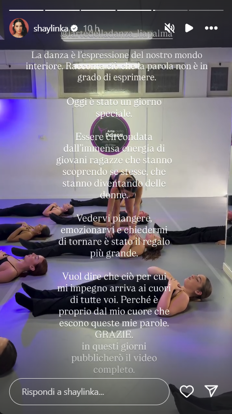 Ecco riportate, di seguito, le dichiarazioni di Shaila su Instagram: “La danza è l’espressione del nostro mondo interiore. Racconta ciò che la parola non è in grado di esprimere. Oggi è stato un giorno speciale. Essere circondata dall’immensa energia di giovani ragazze che stanno scoprendo sé stesse, che stanno diventando delle donne. Vedervi piangere, emozionarvi e chiedermi di tornare è stato il regalo più grande”.
