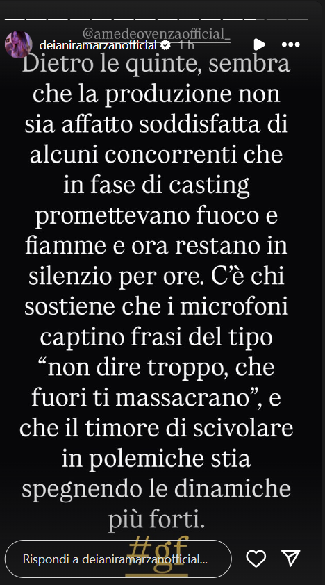 Di seguito, le dichiarazioni dell’esperta di gossip campana d’origine: “Dietro le quinte, sembra che la produzione non sia affatto soddisfatta di alcuni concorrenti che in fase di casting promettevano fuoco e fiamma e ora restano in silenzio per ore. C’è chi sostiene che i microfoni captino frasi del tipo ‘non dire troppo, che fuori ti massacrano’. E pare che il timore di scivolare in polemiche stia spegnendo le dinamiche più forti”.