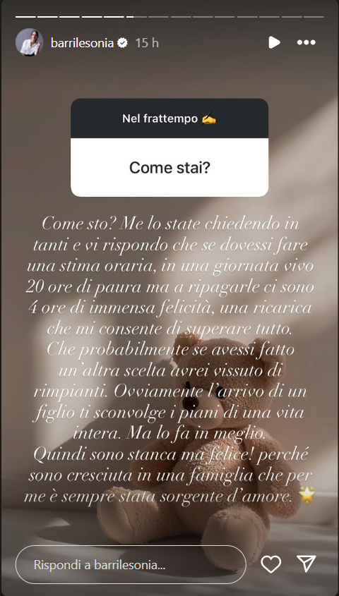 Ecco riportate, di seguito, le dichiarazioni di Sonia: “Come sto? Me lo state chiedendo in tanti e vi rispondo che se dovessi fare una stima oraria, in una giornata vivo 20 ore di paura, ma a ripagarle ci sono 4 ore di immensa felicità, una ricarica che mi consente di superare tutto. Che probabilmente se avessi fatto un’altra scelta avrei vissuto di rimpianti”.