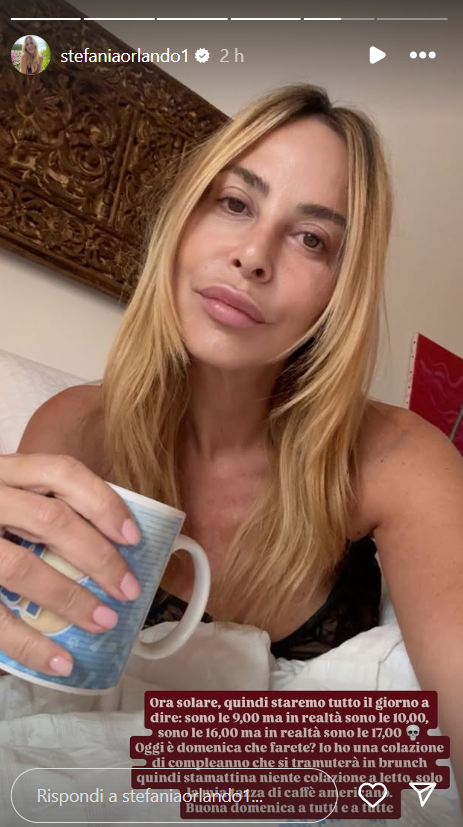 Ecco riportate, di seguito, le dichiarazioni della Orlando: “Ora solare, quindi staremo tutto il giorno a dire: sono le 09:00, ma in realtà sono le 10:00. Sono le 16:00, ma in realtà sono le 17:00. Oggi è domenica, che farete? Io ho una colazione di compleanno che si trasformerà in branch. Quindi stamattina niente colazione a letto. Buona domenica a tutti e a tutte”.