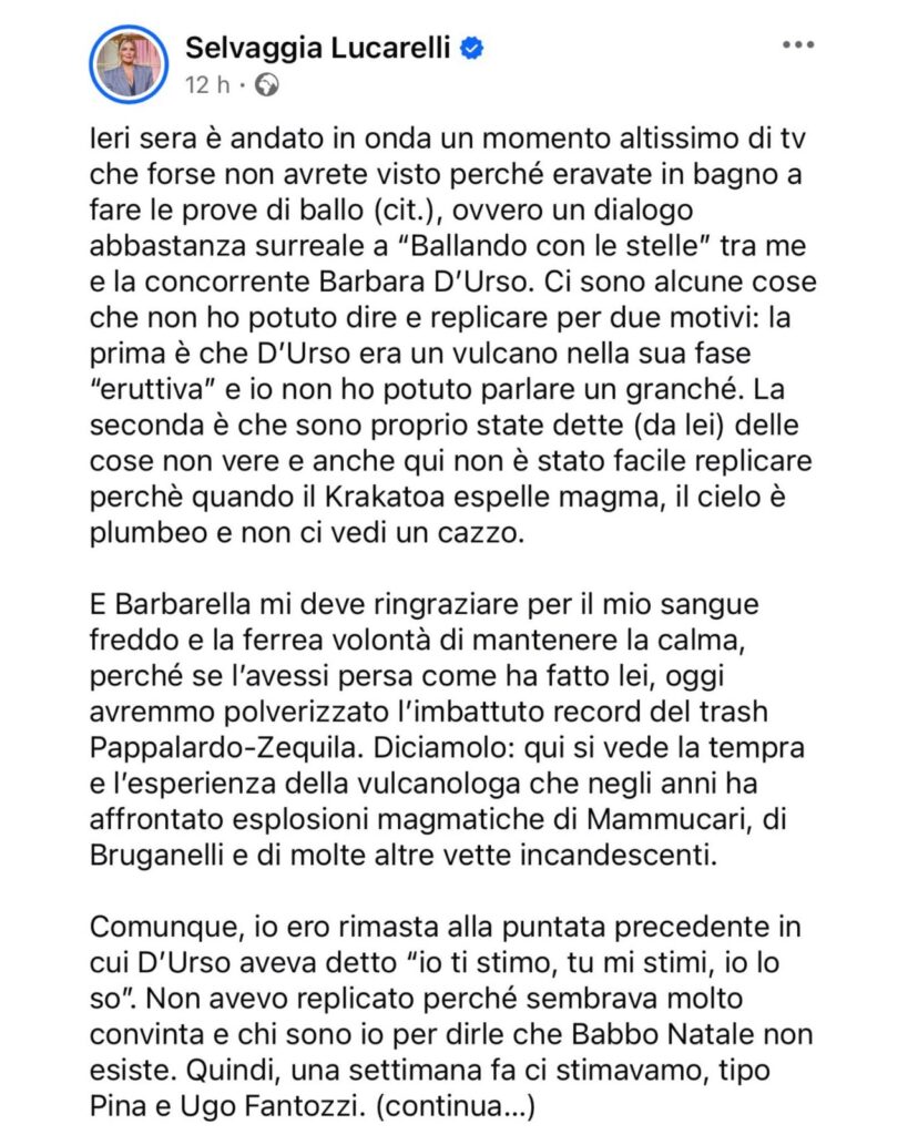 Ecco le dichiarazioni della Lucarelli: “Ieri sera è andato in onda un momento altissimo di tv che forse non avrete visto perché eravate in bagno a fare le prove di ballo, ovvero un dialogo abbastanza surreale a Ballando Con Le Stelle tra me e la concorrente Barbara D’Urso. Ci sono alcune cose che non ho potuto dire e replicare per due motivi: la prima è che D’Urso era un vulcano nella sua fase eruttiva e io non ho potuto parlare un granché”.