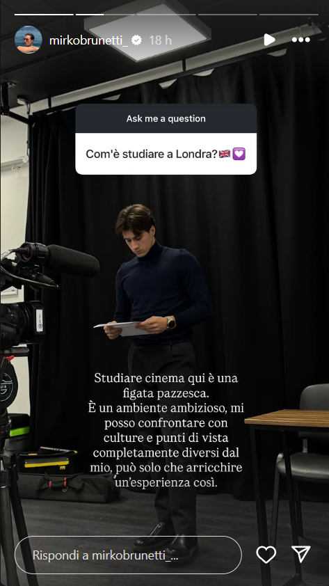 Ecco riportate, di seguito, le dichiarazioni di Brunetti sul suo profilo Instagram ufficiale: “Studiare cinema a Londra è una figata pazzesca.. è un ambiente ambizioso, mi posso confrontare con culture e punti di vista completamente diversi dal mio, può solo che arricchire una esperienza così”.
