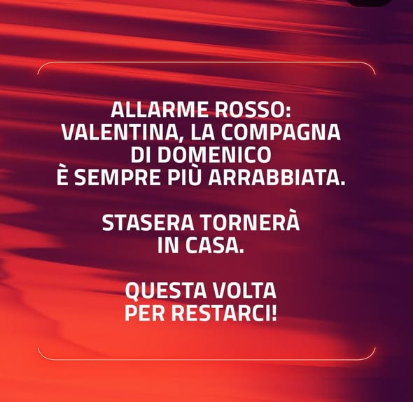 Ecco l’annuncio di Simona Ventura sul suo Canale Instagram Ufficiale: “Allarme rosso: Valentina, la compagna di Domenico, è sempre più arrabbiata. Stasera tornerà in casa. Questa volta per restarci!”.