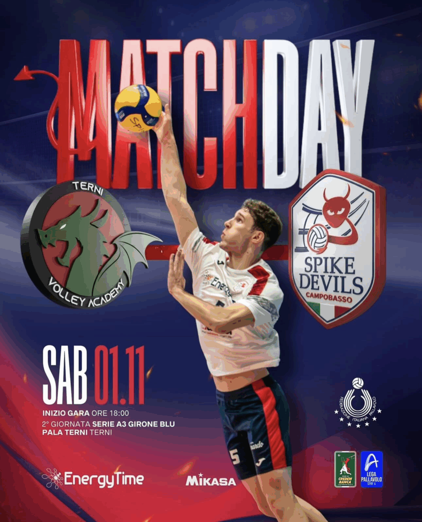 Ecco tutte le news dettagliate: domani, sabato 1 novembre 2025, si terrà la seconda partita del campionato della Terni Volley Academy contro la Spike Devils, dalle ore 18:00 al Pala Terni (Terni).