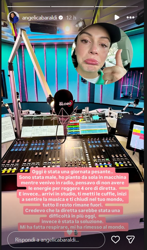 Ecco riportate, di seguito, le dichiarazioni di Angelica Baraldi: “Oggi è stata una giornata pesante.. Sono stata male, ho pianto da sola in macchina… mentre venivo in radio, pensavo di non avere le energie per reggere 4 ore di diretta. E invece.. arrivi in studio, ti metti le cuffie, inizi a sentire la musica e ti chiudi nel tuo mondo, tutto il resto è fuori.. e rimane fuori. Credevo che la diretta sarebbe stata una difficoltà in più oggi, invece è stata la soluzione. Mi ha fatta respirare, mi ha rimessa al mondo”, ha scritto l’ex gieffina.