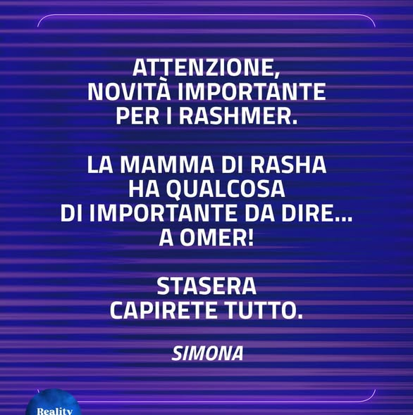 Ecco quanto svelato da Simona Ventura su Instagram: “Attenzione, novità importante per i Rashmer. La mamma di Rasha ha qualcosa di importante da dire… a Omer! Stasera capirete tutto”.