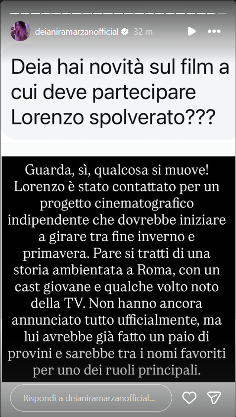 Ecco riportate, di seguito, le parole di Deianira Marzano sul suo profilo Instagram ufficiale: “Guarda, sì, qualcosa si muove! Lorenzo è stato contattato per un progetto cinematografico indipendente che dovrebbe iniziare a girare tra fine inverno e primavera. Pare si tratti di una storia ambientata a Roma, con un cast giovane e qualche volto noto della TV. Non hanno ancora annunciato tutto ufficialmente, ma lui avrebbe già fatto un paio di provini e sarebbe tra i nomi favoriti per uno dei ruoli principali”.