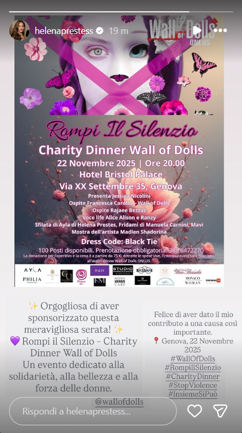 Ecco riportate, di seguito, le dichiarazioni di Helena sul suo profilo Instagram ufficiale: “Orgogliosa di aver sponsorizzato questa meravigliosa serata! Rompi il silenzio-Charity Dinner Wall of Dolls. Un evento dedicato alla solidarietà, alla bellezza e alla forza delle donne. Felice di aver dato il mio contributo a una causa così importante. Genova, 22 novembre 2025”.