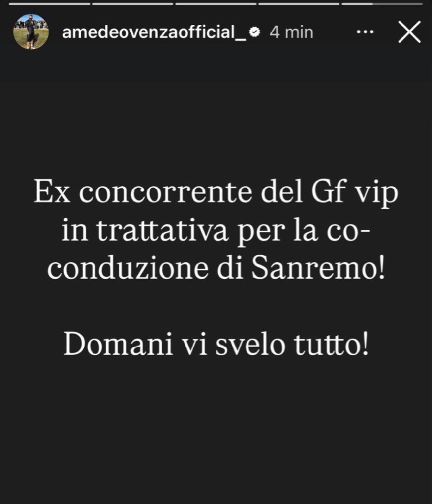 Ecco riportate, di seguito, le parole di Amedeo Venza sui social: “Ex concorrente del GF VIP in trattativa per la co-conduzione di Sanremo. Domani vi svelo tutto”, ha scritto sui social network l’esperto di gossip e noto influencer.