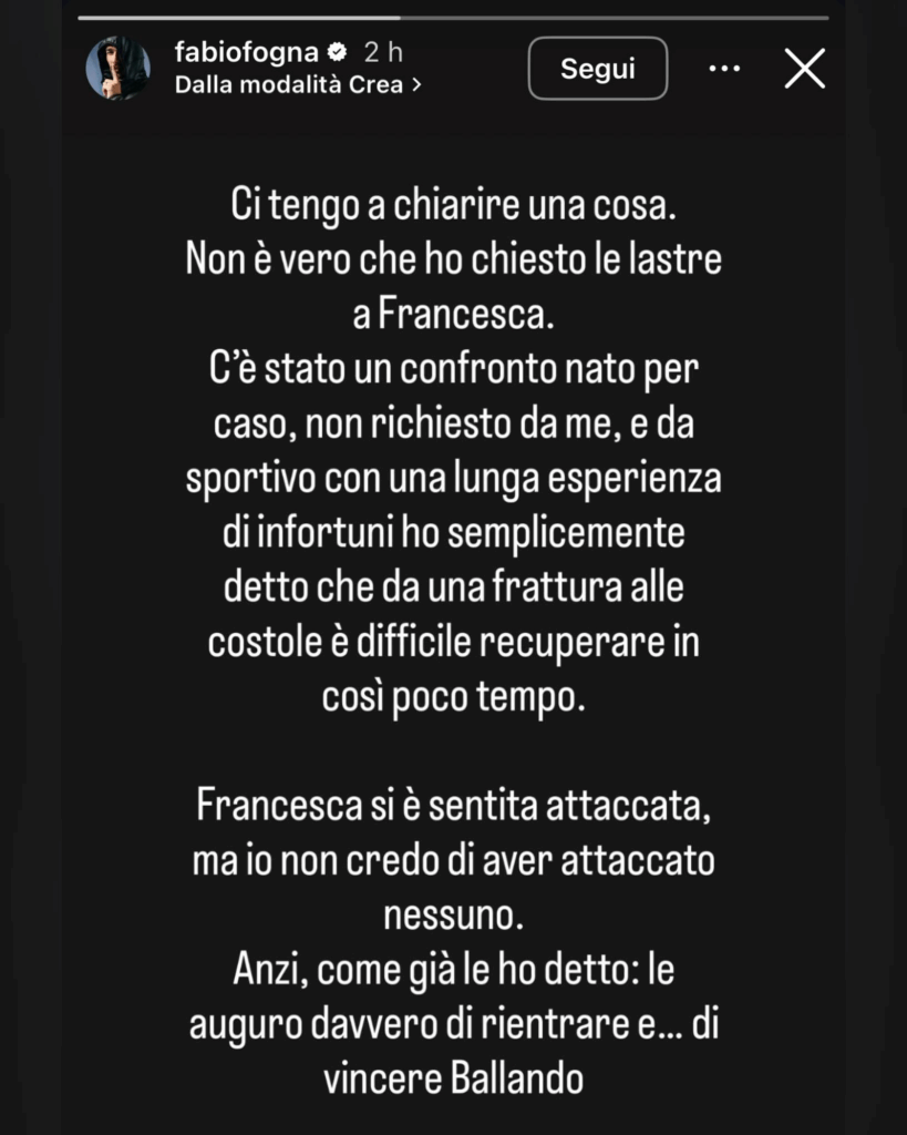 Ecco le dichiarazioni di Fabio: “Ci tengo a chiarire una cosa. Non è vero che ho chiesto le lastre a Francesca. C’è stato un confronto nato per caso, non richiesto da me, e da sportivo con una lunga esperienza di infortuni ho semplicemente detto che da una frattura alle costole è difficile recuperare in così poco tempo. Francesca si è sentita attaccata, ma io non credo di aver attaccato nessuno. Anzi, come già le ho detto: le auguro davvero di rientrare e… di vincere Ballando Con le Stelle“.