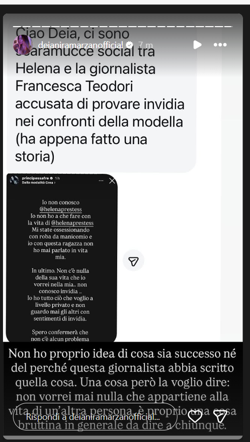 Ecco riportate, di seguito, le dichiarazioni della Teodori: “Io non conosco Helena Prestes, io non ho a che a fare con la vita della brasiliana. Mi state ossessionando con roba da manicomio e io con questa ragazza non ho mai parlato in vita mia. In ultimo non c’è nulla della sua vita che io vorrei nella mia.. non conosco invidia.. Io ho tutto ciò che voglio a livello privato e non guardo mai gli altri con sentimenti di invidia. Spero confermerà che non c’è alcun problema”.