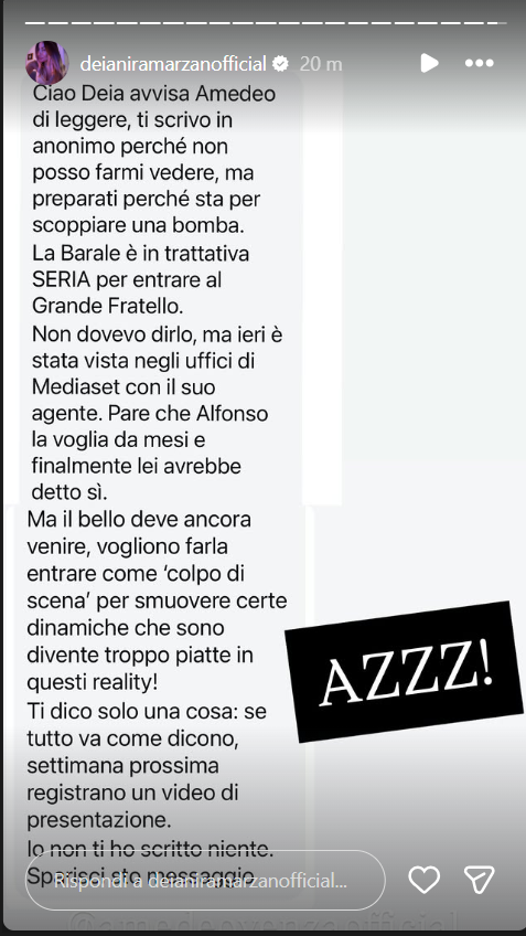 Ecco riportate, di seguito, le parole di Deianira Marzano sul suo profilo Instagram ufficiale: “La Barale è in trattativa seria per entrare al Grande Fratello. Non volevo dirlo, ma ieri è stata vista negli uffici di Mediaset con il suo agente. Pare che Alfonso la voglia da mesi e finalmente lei avrebbe detto sì. Ma il bello deve ancora venire, vogliono farla entrare come ‘Colpo di scena’ per smuovere certe dinamiche che sono diventate troppo piatte in questo reality”.