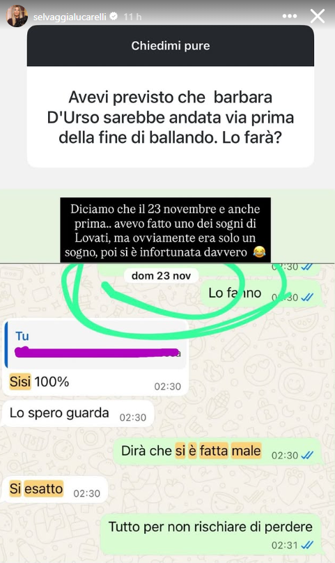 Il caso esploso attorno a Ballando con le Stelle non accenna a placarsi. Selvaggia Lucarelli risponde ad un utente che le ricorda come lei avesse predetto il ritiro di Barba D’Urso dal programma. Così pubblica una chat datata 23 novembre, nella quale ipotizzava che Barbara d’Urso potesse lasciare il programma prima della finale. Ma cosa pensa davvero la coppia? Barbara e il suo maestro Pasquale La Rocca hanno chiarito in una live un punto decisivo: non hanno alcuna intenzione di ritirarsi.