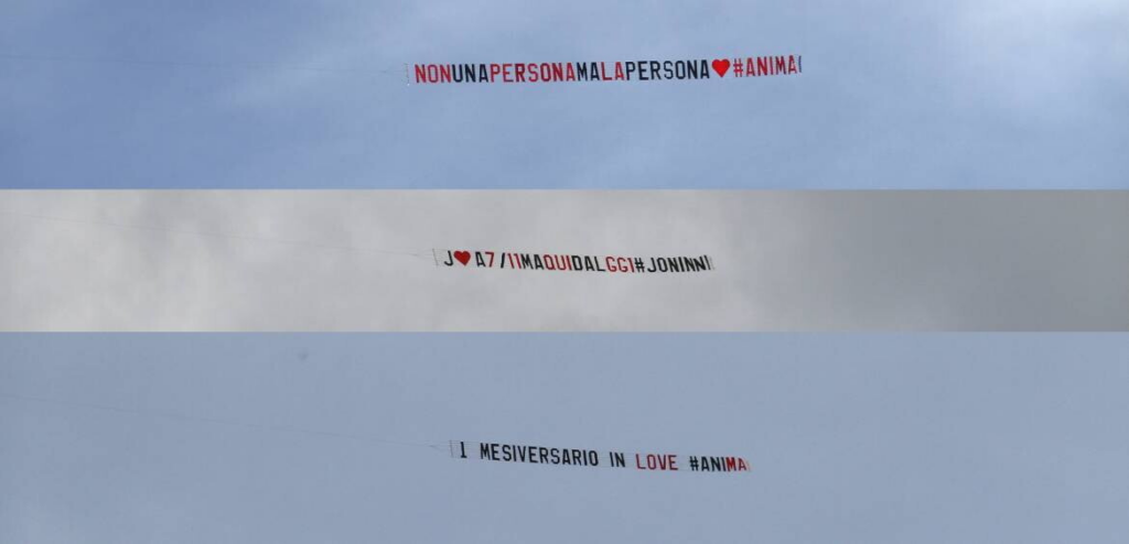 Il secondo striscione invece recita: “Jonas e Anita, qui dal giorno 1″. Infine, il terzo aereo con striscione porta il seguente messaggio: “1 mesiversario in love, #anima”.