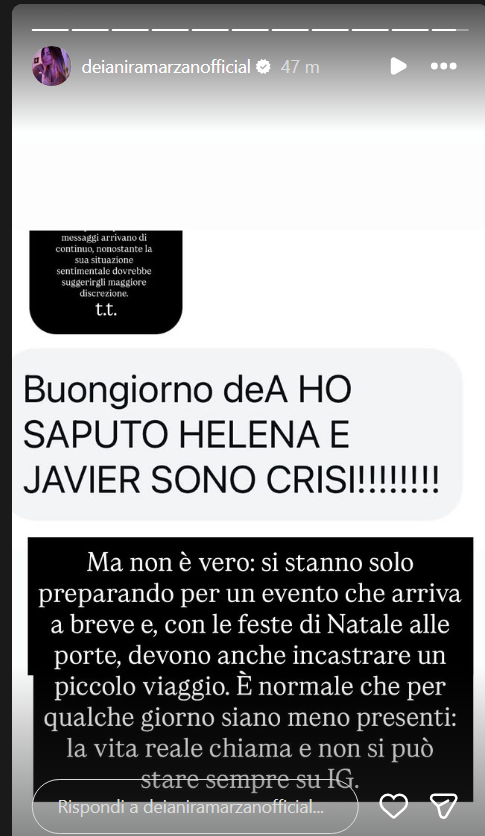 Ecco riportate, di seguito, le dichiarazioni di Deianira Marzano su Instagram: “Ma non è vero ragazzi, nessuna crisi fra Helena Prestes e Javier Martinez”.