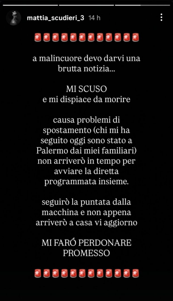 Ecco riportate, di seguito, le parole di Mattia sul suo profilo Instagram ufficiale: “A malincuore devo darvi una brutta notizia… Mi scuso e mi dispiace da morire, causa problemi di spostamento (chi mi ha seguito oggi sono stato a Palermo dai miei familiari) non arriverò in tempo per la diretta programmata insieme. Seguirò la puntata dalla macchina e non appena arriverò a casa vi aggiorno. Mi farò perdonare promesso”.