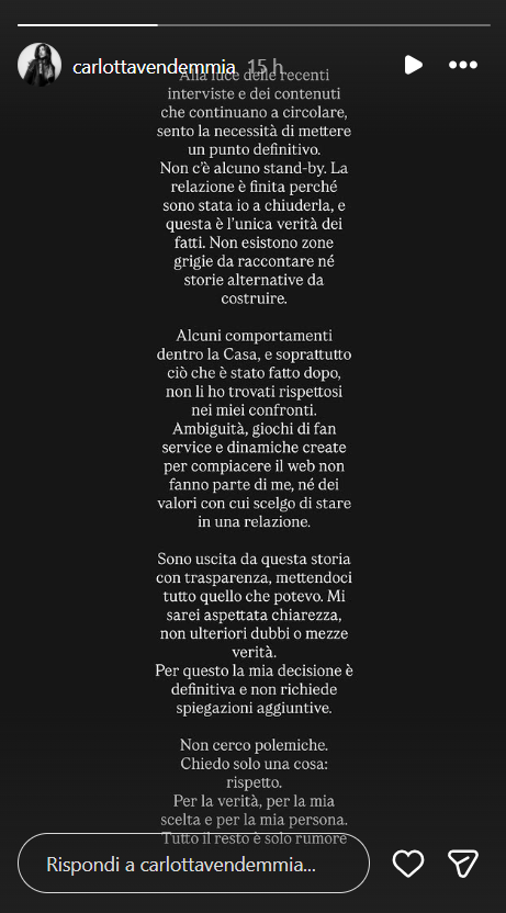 Ecco le dichiarazioni di Carlotta sui social: “Alla luce delle recenti interviste e dei contenuti che continuano a circolare, sento la necessità di mettere un punto definitivo. Non c’è alcuno stand-by. La relazione è finita perché sono stata io a chiuderla, e questa è l’unica verità dei fatti. Non esistono zone grigie da raccontare né storie alternative da costruire”.
