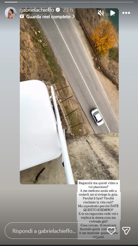 Ecco riportate, di seguito, le dichiarazioni di Gabriela: “Ragazzi ma questi video a voi piacciono? A me mettono ansia solo a vederli, mi si stringe la gola. Perché li fate? Perché rischiate la vita così? Ma soprattutto perché date questo esempio? E se un ragazzino vede voi, ripete gli stessi gesti e cade giù? Cosa cercate di mostrare facendo questi contenuti?”- ha scritto la Chieffo sui social.