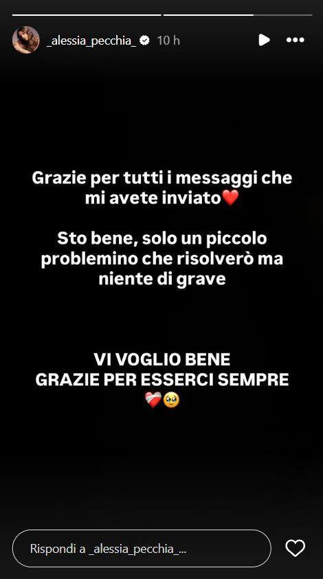 Ecco riportate, di seguito, le parole di Alessia Pecchia sui social: “Grazie per tutti i messaggi che mi avete inviato. Sto bene, solo un piccolo problemino che risolverò ma niente di grave. Vi voglio bene”.