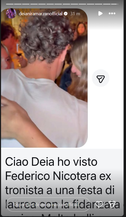 Ecco le dichiarazioni di un utente, riportate dalla Marzano sui social: “Ciao Deia ho visto Federico Nicotera ex tronista a una festa di laurea con la sua nuova fidanzata”.