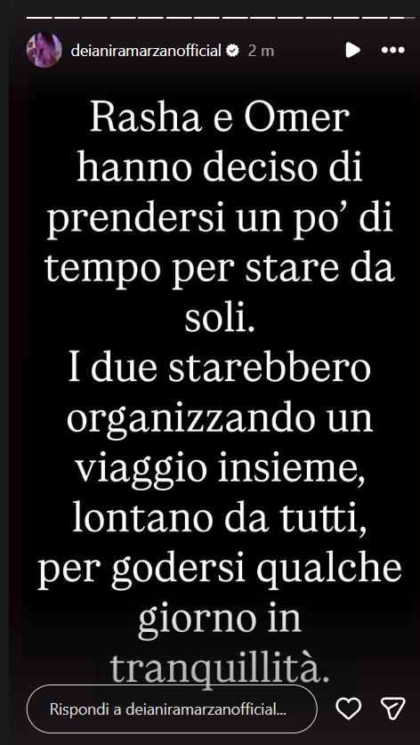 Ecco le dichiarazioni della Marzano sui social: “Raha e Omer hanno deciso di prendersi un po’ di tempo per stare da soli. I due starebbero organizzando un viaggio insieme, lontani da tutto e tutti”.