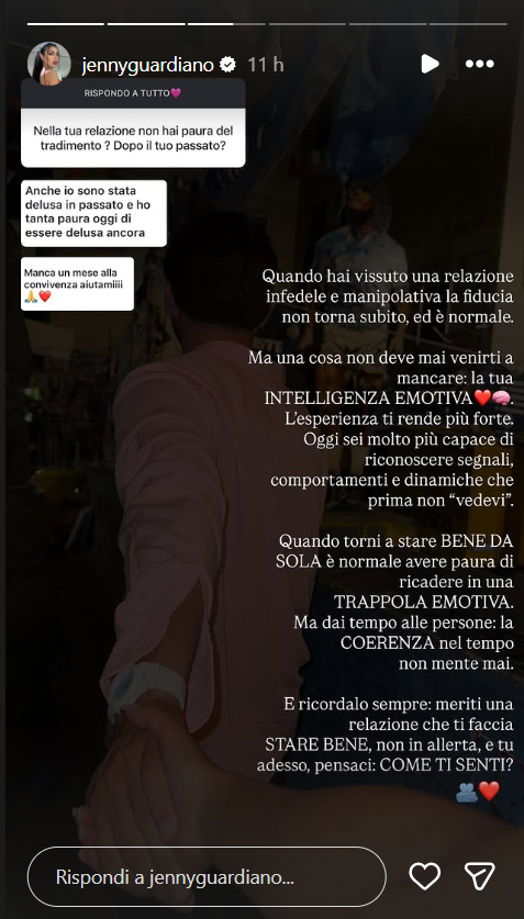 Ecco riportate, di seguito, le dichiarazioni di Guardiano: “Quando hai vissuto una relazione infedele e manipolativa la fiducia non torna subito, ed è normale”, ha esordito Jenny sui social.