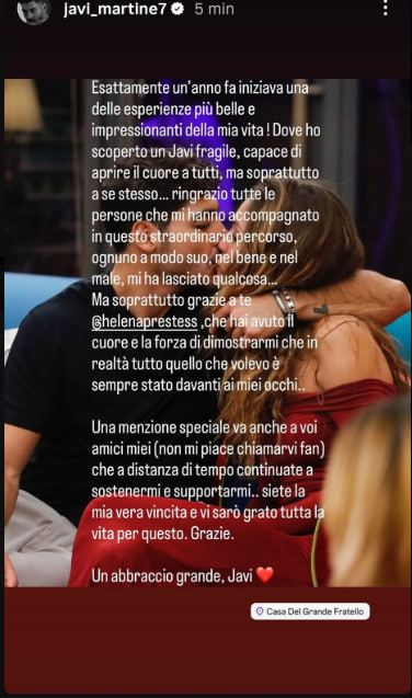 Ecco riportate, di seguito, le dichiarazioni di Javier Martinez sul suo account: “Esattamente un anno fa iniziava una delle esperienze più belle e impressionanti della mia vita! Dove ho scoperto un Javi fragile, capace di aprire il cuore a tutti, ma soprattutto a sé stesso… ringrazio tutte le persone che mi hanno accompagnato in questo straordinario percorso, ognuno a modo suo, nel bene e nel male, mi ha lasciato qualcosa.. Ma soprattutto grazie a te Helena, che hai avuto il cuore e la forza di dimostrarmi che in realtà tutto quello che volevo è sempre stato davanti ai miei occhi..”.