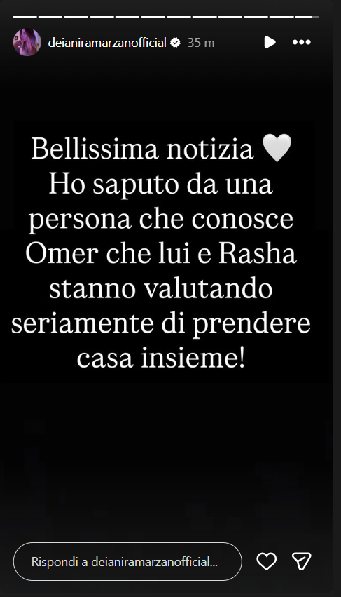 Di seguito, le dichiarazioni di Deianira Marzano: “Bellissima notizia. Ho saputo da una persona che conosce Omer che lui e Rasha stanno valutando di prendere casa insieme”.