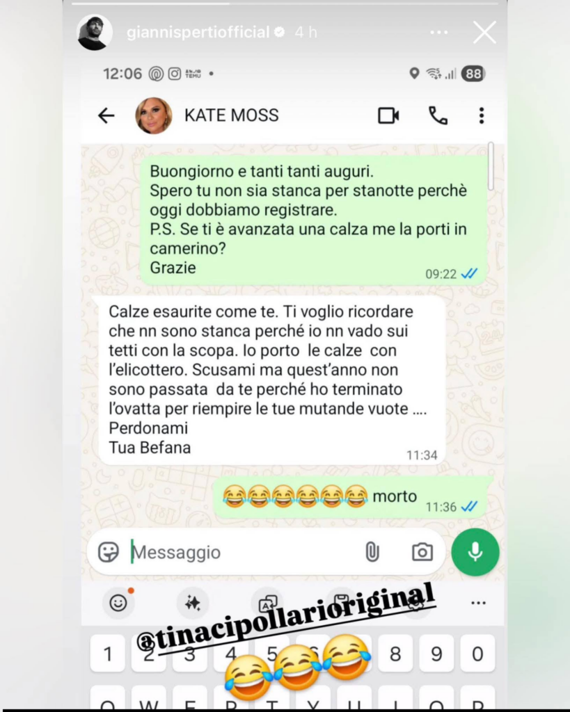 A pubblicare lo screenshot è stato Gianni Sperti, che ha mostrato una conversazione WhatsApp salvata con il contatto “Kate Moss”, ironico soprannome assegnato a Tina Cipollari. Il messaggio di Gianni è già una dichiarazione d’intenti: “Buongiorno e tanti tanti auguri. Spero tu non sia stanca per stanotte perché oggi dobbiamo registrare. P.S. Se ti è avanzata una calza me la porti in camerino?”