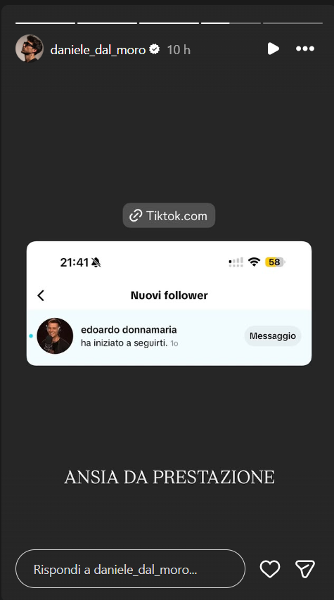EDOARDO DONNAMRIA SEGUE DANIELE DAL MORO: COLPO DI TEATRO- In queste ore, l’ex volto del reality di Mediaset al cui timone abbiamo visto Alfonso Signorini, ha iniziato a seguire Daniele Dal Moro su Tik Tok. Scopriamo insieme come l’imprenditore veronese ha reagito.