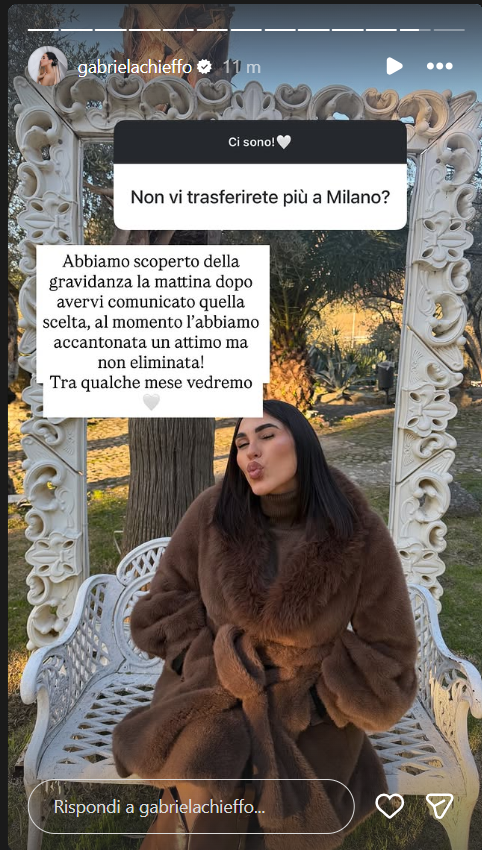 Ecco riportate, di seguito, le dichiarazioni di Chieffo: “Abbiamo scoperto della gravidanza la mattina dopo avervi comunicato quella scelta, al momento l’abbiamo accantonata un attimo ma non eliminata! Tra qualche mese vedremo”.