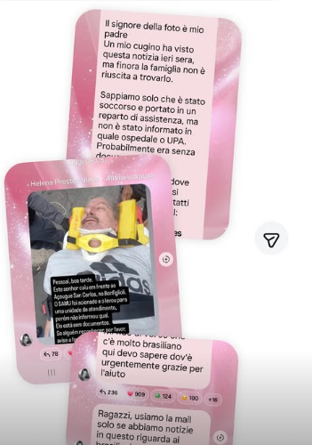 Ecco riportate, di seguito, le dichiarazioni di Helena su Instagram: “Il signore della foto è mio padre. Un mio cugino ha visto questa notizia ieri sera, ma finora la famiglia non è riuscita a trovarlo. Sappiamo solo che è stato soccorso e portato in un reparto di assistenza, ma non è stato informato in quale ospedale o UPA. Probabilmente era senza documenti”.