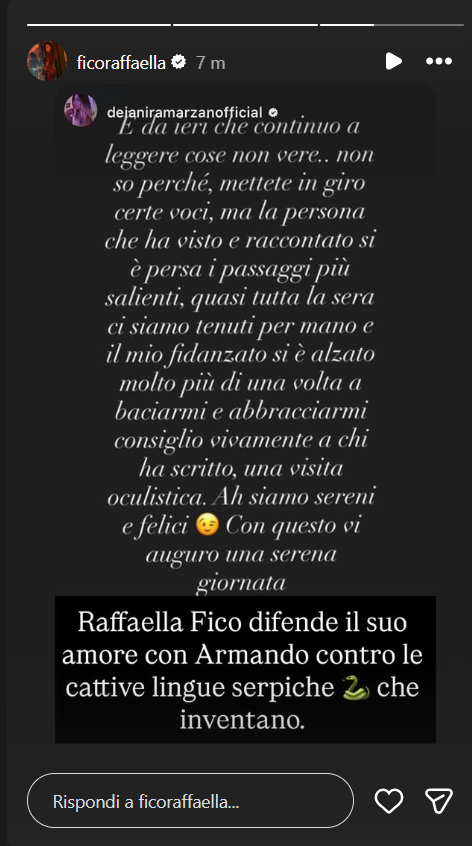 Ecco riportate, di seguito, le parole di Raffaella Fico su Instagram: “E’ da ieri che continuo a leggere cose non vere.. non so perché, mettete in giro certe voci, ma la persona che ha visto e raccontato si è persa i passaggi più salienti, quasi tutta la sera ci siamo tenuti per mano e il mio fidanzato si è alzato molto più di una volta a baciarmi e abbracciarmi. Consiglio vivamente a chi ha scritto, una visita oculistica. Ah siamo sereni e felici. Con questo vi auguro una buona giornata”, ha concluso l’ex vippona.