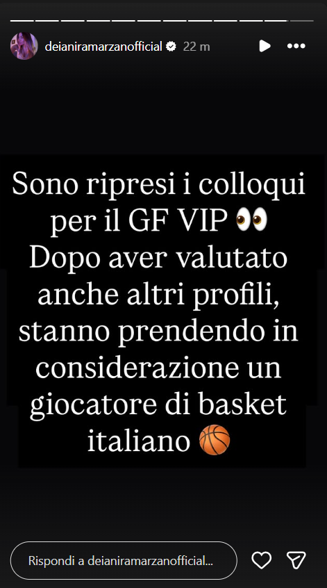 Ecco riportate, di seguito, le dichiarazioni di Deianira Marzano sul suo profilo Instagram ufficiale: “Sono ripresi i colloqui per il GF VIP. Dopo aver valutato anche altri profili, stanno prendendo in considerazione un giocatore di basket italiano”.