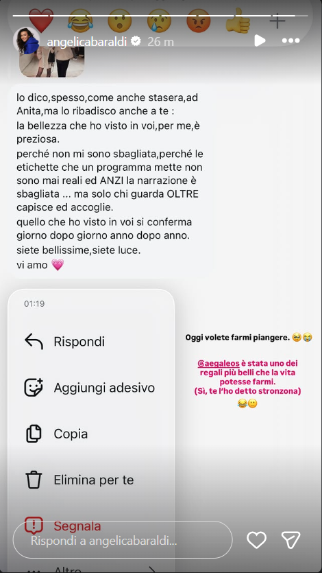 Ecco riportate, di seguito, le parole di Angelica su Instagram: “Anita è stata una dei regali più belli che la vita potesse farmi. Sì, te l’ho detto str*****a”.