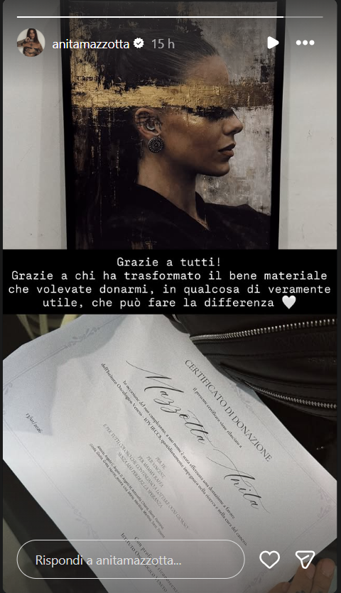 Ecco riportate, di seguito, le dichiarazioni di Anita Mazzotta sui social: “Grazie a tutti! Grazie a chi ha trasformato il bene materiale che volevate donarmi, in qualcosa di veramente utile, che può fare la differenza”.