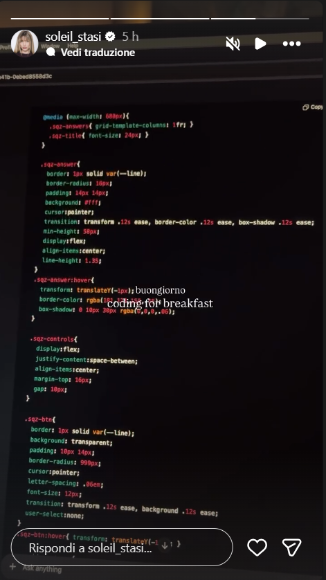 Ecco la story pubblicata su Instagram da Soleil Stasi Sorge: “Coding a colazione”, ha scritto l’ex vippona che durante la settima edizione del reality show di Canale5 condotto da Alfonso Signorini fece perdere completamente la testa ad Alex Belli.