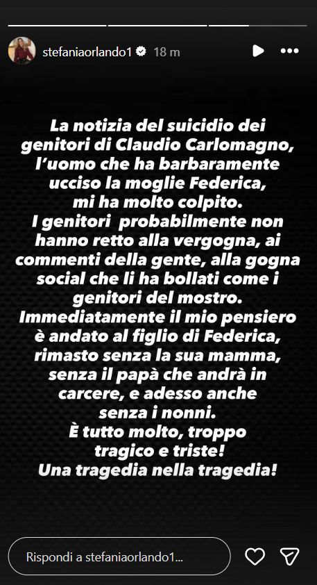 Ecco riportate, di seguito, le dichiarazioni di Stefania: “La notizia del suicidio dei genitori di Claudio Carlomagno, l’uomo che ha barbaramente ucciso la moglie Federica, mi ha molto colpito. I genitori probabilmente non hanno retto alla vergogna, ai commenti della gente, alla gogna social che li ha bollati come i genitori del mostro. Immediatamente il mio pensiero è andato al figlio di Federica, rimasto senza la sua mamma, senza il papà che andrà in carcere, e adesso anche senza i nonni”.