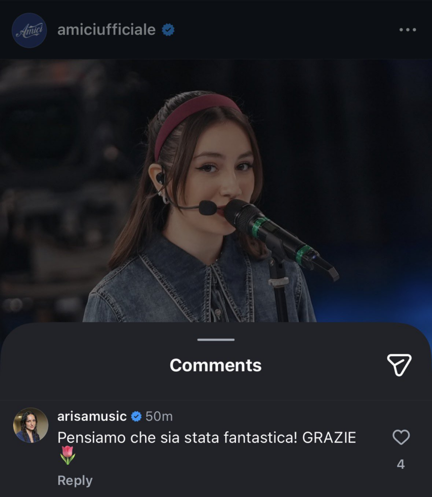 ARISA, IL LIKE ALL’ESIBIZIONE DI ANGIE: IL COMMENTO DELL’EX DOCENTE DI AMICI DI MARIA DE FILIPPI VIRALE (FOTO)- In queste ore, l’ex amatissima docente del talent show di Maria De Filippi, ha rilasciato delle importanti dichiarazioni sui social. Scopriamo insieme che cos’ha detto a proposito di Angie, cantante messa costantemente in discussione dalla sua maestra, Anna Pettinelli.