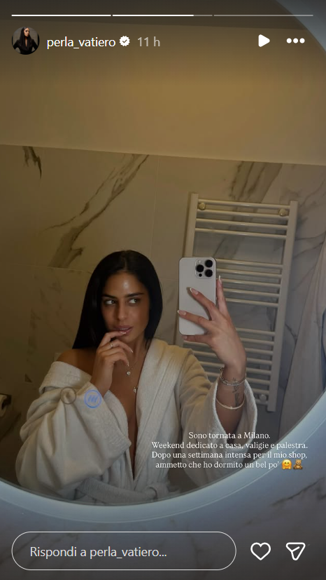 Ecco riportate, di seguito, le parole di Perla Vatiero su Instagram: “Sono tornata a Milano.. weekend dedicato a casa, valige, e palestra. Dopo una settimana intensa e per il mio shop, ammetto che ho dormito un bel po’”.