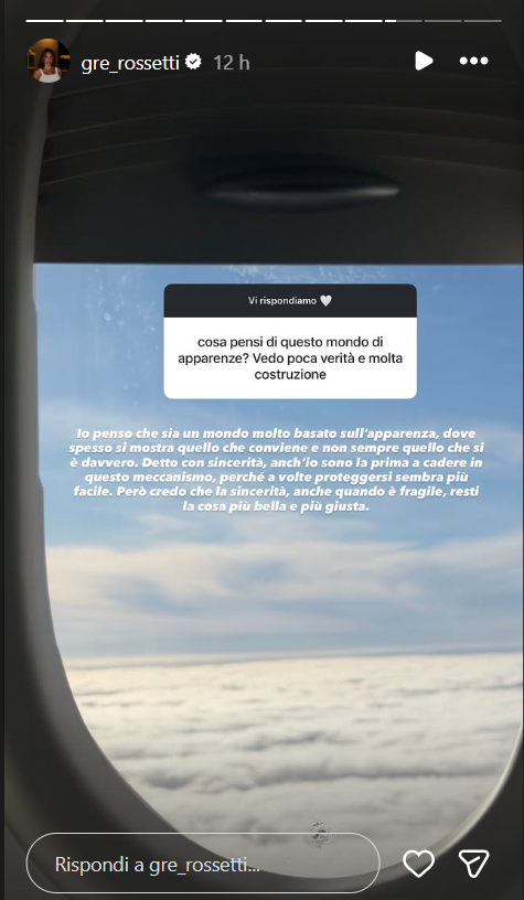 Ecco riportate, di seguito, le dichiarazioni dell’ex concorrente del Grande Fratello 18: “Io penso che sia un mondo molto basato sull’apparenza, dove spesso si mostra quello che conviene e non sempre quello che si è davvero. Detto con sincerità, anch’io sono la prima a cadere in questo meccanismo, perché a volte proteggersi sembra più facile. Però credo che la sincerità, anche quando è fragile, resti la cosa più bella e giusta”.