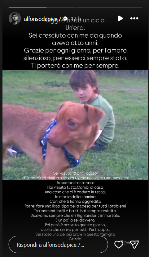 Ecco le dichiarazioni di Alfonso: “Oggi è finito un ciclo. Un’era. Sei cresciuto con me da quando avevo otto anni. Grazie per ogni giorno, per l’amore silenzioso, per esserci sempre stato. Ti porterò con me per sempre”.