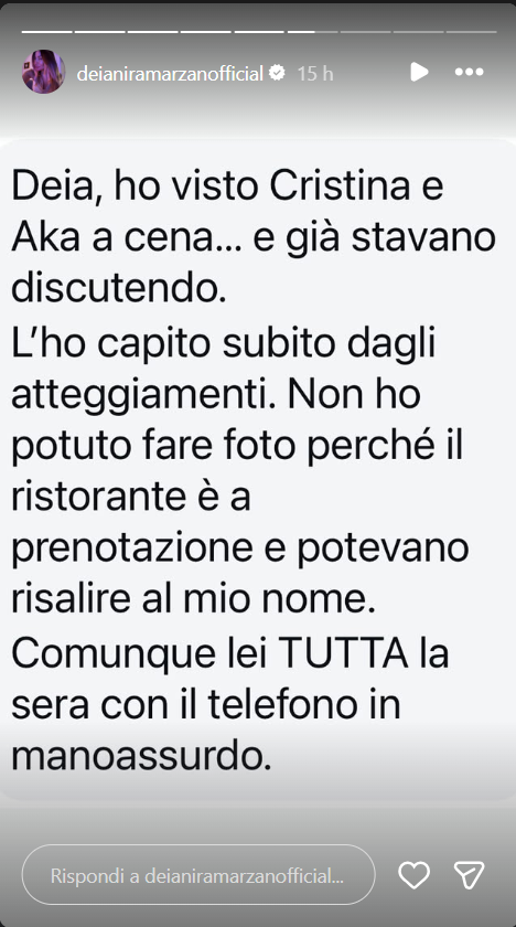 Ecco riportate, di seguito, le dichiarazioni di una follower di Deianira Marzano sul suo profilo Instagram ufficiale: “Cristina e Aka a cena… e già stavano discutendo. L’ho capito subito dagli atteggiamento. Non ho potuto fare foto perché il ristorante è a prenotazione e potevano risalire al mio nome. Comunque lei tutta la sera con il telefono in mano, assurdo”.